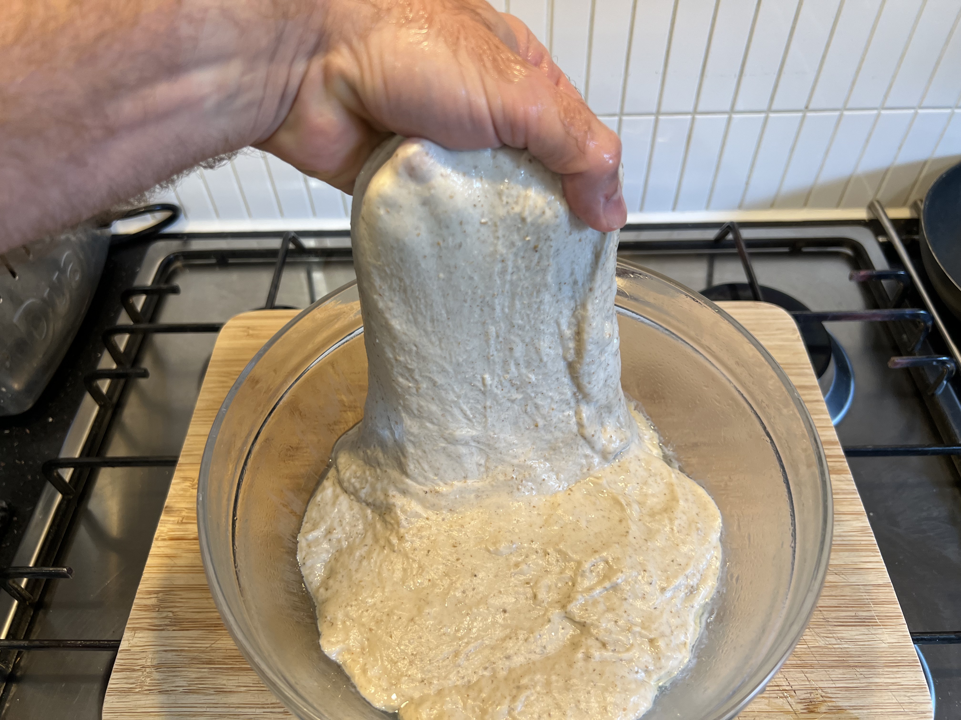 No, not a Pilates or yoga session. This is the bit of my no-BS breadmaker recipe that we do in the bowl, where instead of vigorous kneading we grab the edge of the dough, stretch it up, and fold it over. It 'strengthens the gluten', which basically means it gets smoother, less sticky, and holds its shape better.